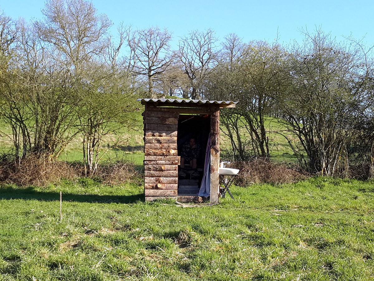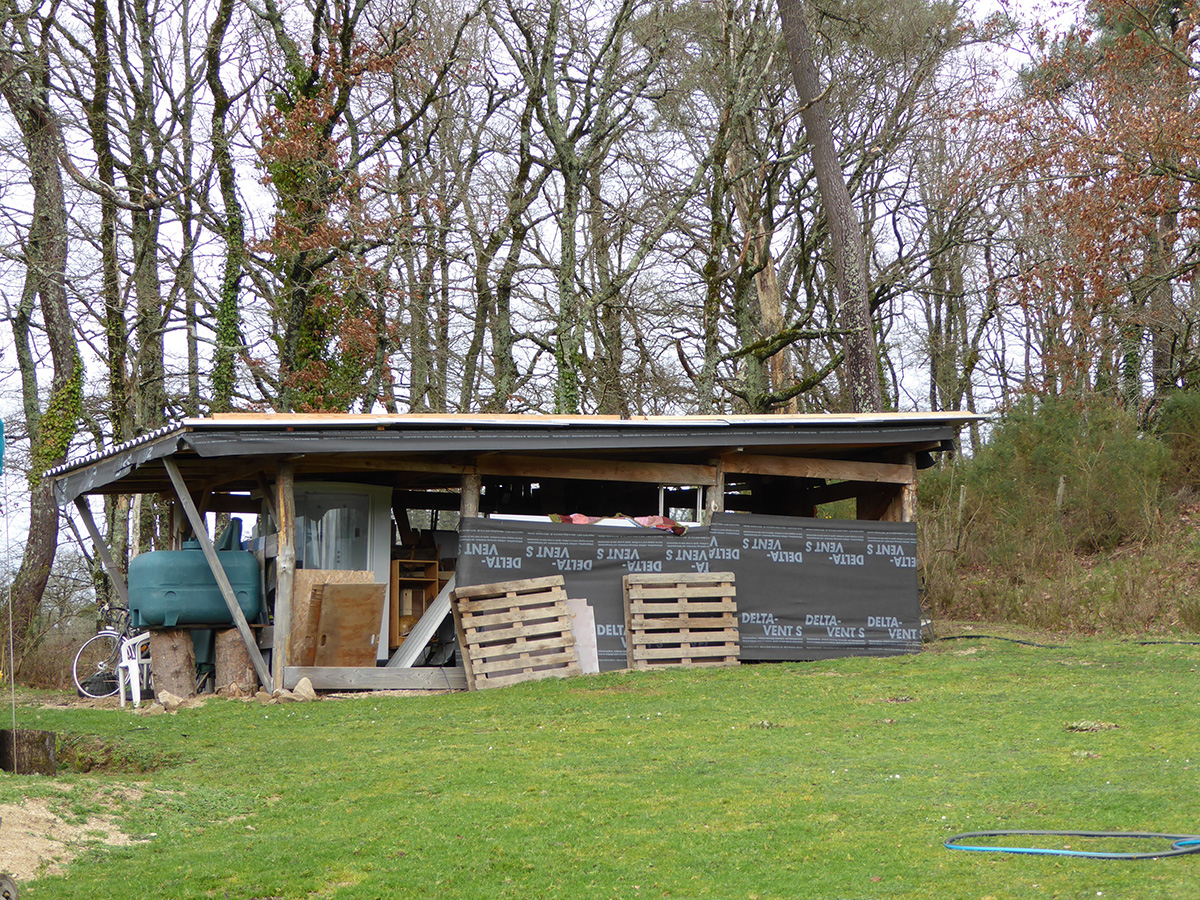 Nous aménageons une cabane annexe, en bois pour accueillir nos amis sur notre site de vie ainsi qu’un atelier/séchoir pour le rangement et le travail.