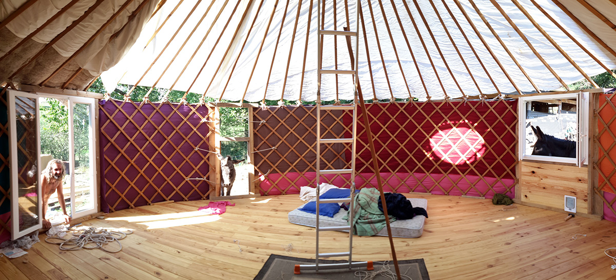 La structure en pins « douglas » régionaux est posée sur une araignée en bois, surélevée. Nous avons créé un double plancher. Entre les toiles intérieures et extérieures, nous avons privilégié un isolant en laine de chanvre d’une épaisseur de 8 cm. L’arrivée d’eau et les toilettes sèches sont à l’extérieur. Nous voyons passer les saisons, chaudes, froides, humides, venteuses, douces bien confortablement installés dans notre cocon léger.